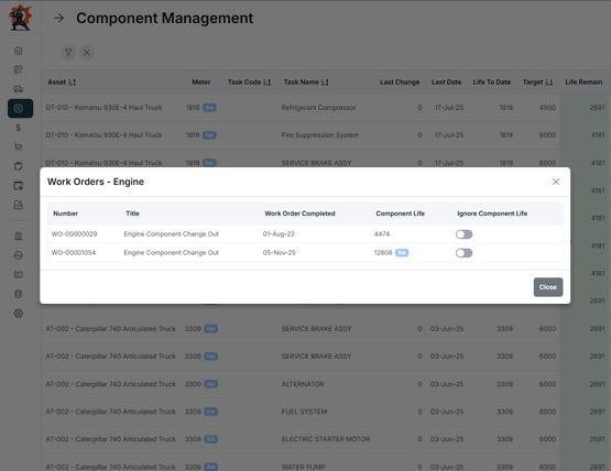 Samurai gives you a clear view of the expected life, usage and remaining service of every major component. Schedule changes and replacements in advance to minimise downtime and keep equipment in top condition. By reviewing component history and analysing performance trends, you can refine maintenance strategies, extend asset life and make confident, data-based decisions.